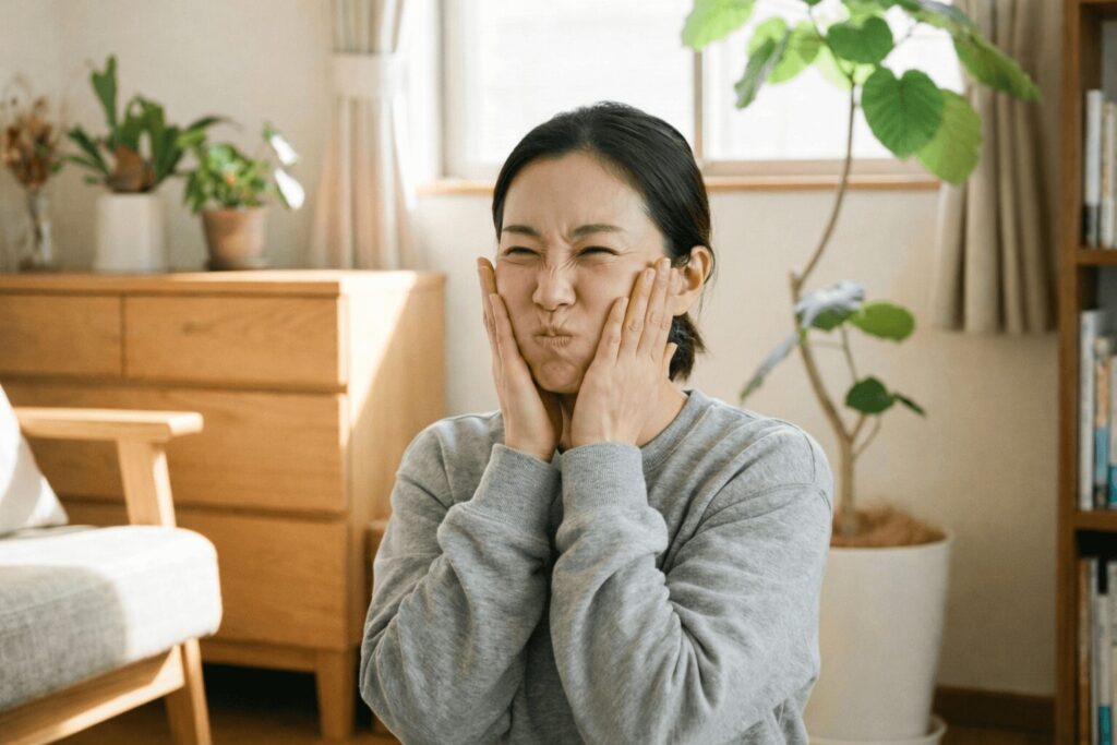 その結果、頬や口角を支える筋肉を使う場面が減り、フェイスラインがぼんやりした印象になりがちです。